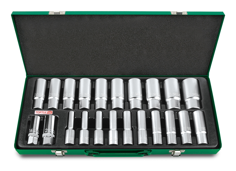 Набор головок удлиненных 1/2" 6-гранных 8-32 мм, 22 предмета в метал. ящике TOPTUL